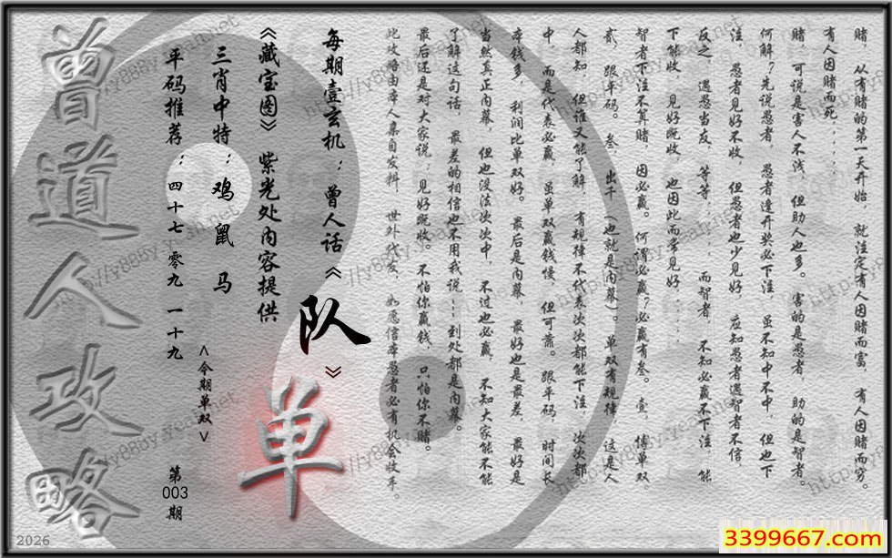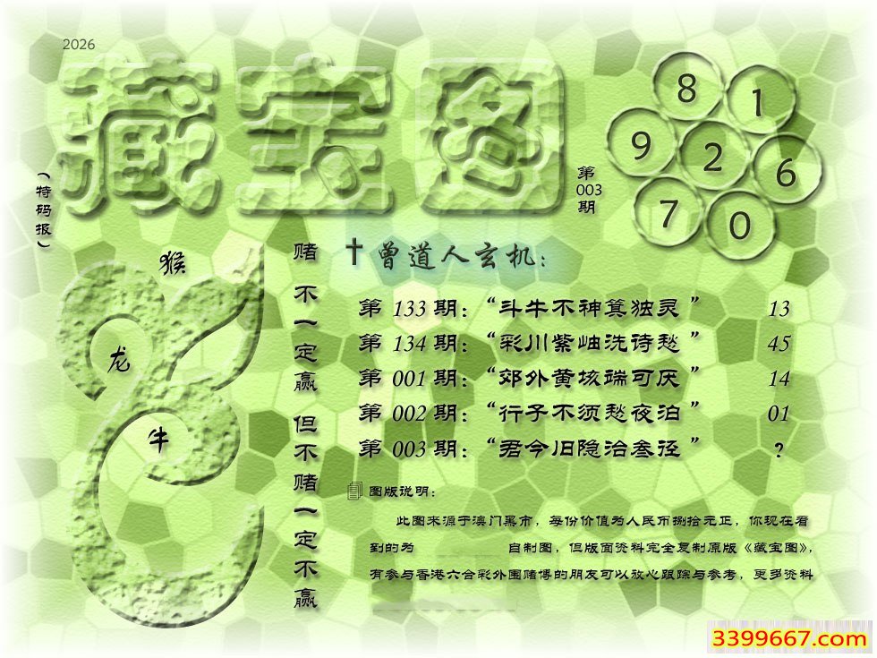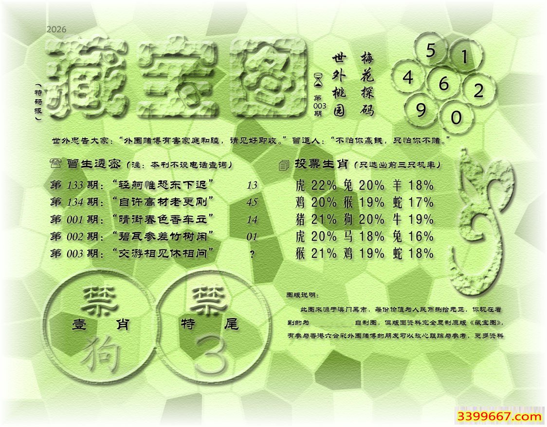 主题 :003期藏寶圖 新:君今旧隐治叁泾 老:交游相见休相问 禁:狗 禁:3尾
